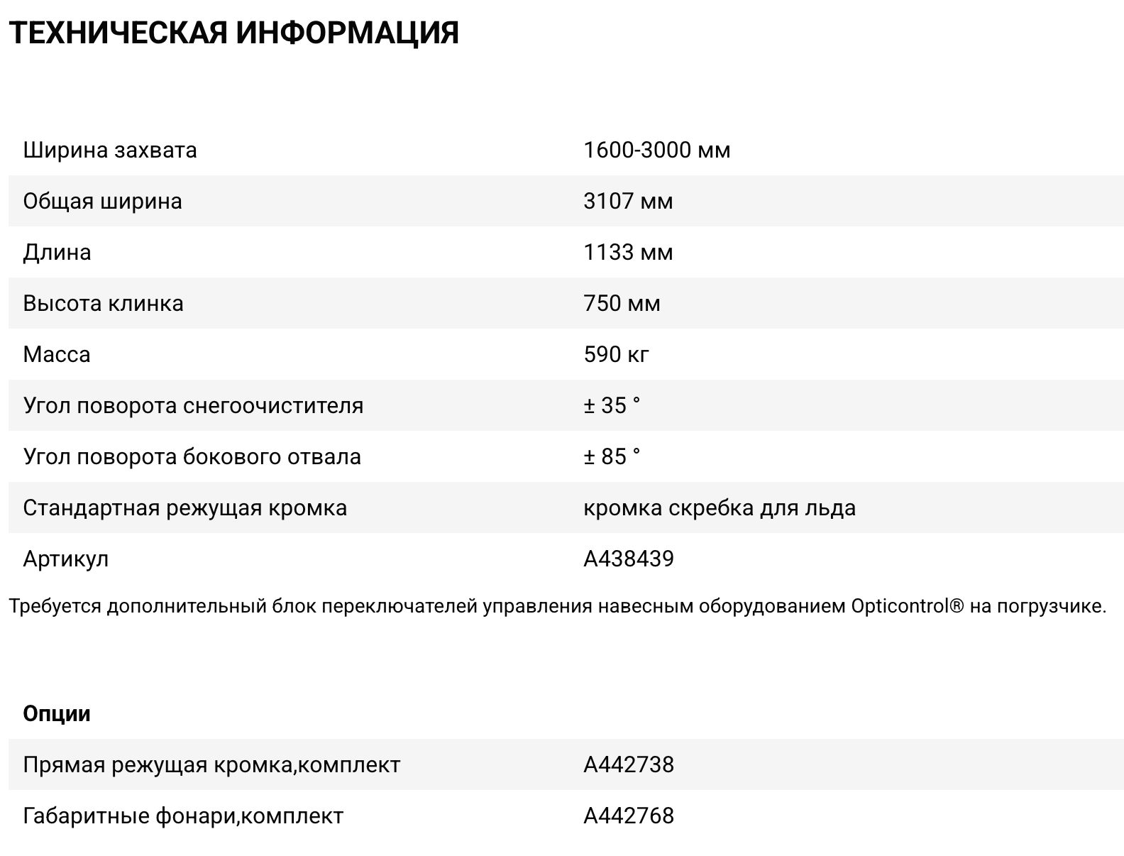 Минимальная рабочая ширина 1,6 м с полностью повернутыми назад боковыми лезвиями, макс. 3 м с прямыми боковыми лезвиями. Поворот снегоочистителя происходит с помощью двух гидроцилиндров; угол поворота составляет ± 35 °. Боковые ножи можно поворачивать независимо или одновременно с переключателями дополнительного блока переключателей управления навесным оборудованием Opticontrol®. Снегоочиститель в стандартной комплектации оборудован режущей кромкой скребка для льда, прямая режущая кромка доступна в качестве опции. Кроме того, вместо стандартных круглых отражателей в качестве опции доступен комплект габаритных фонарей (4 лампы по краям основного и боковых лезвий).