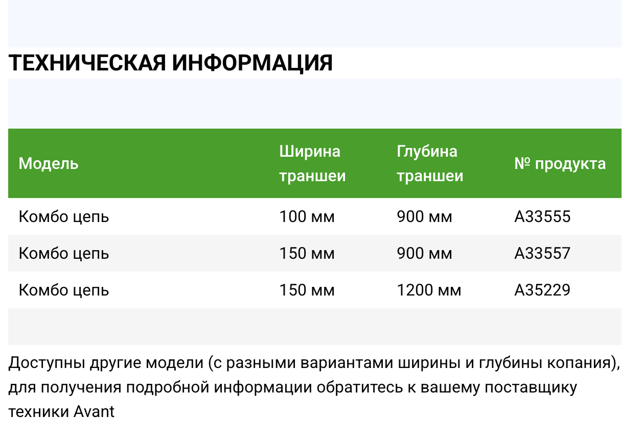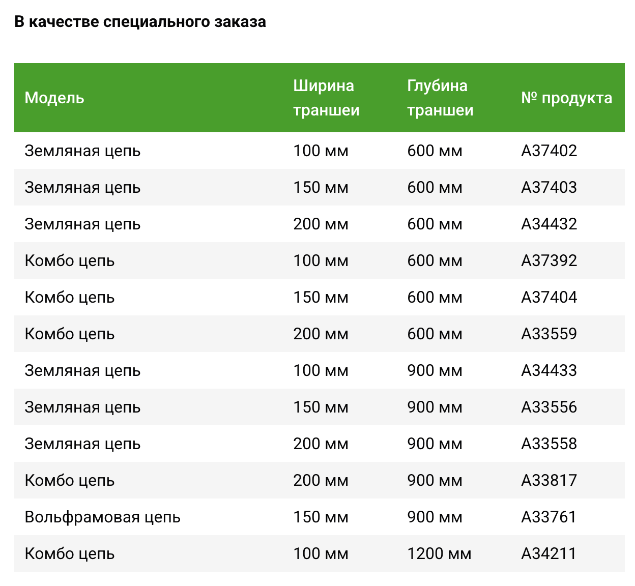 В зависимости от выбора модели глубина копания составляет 900 или 1200 мм. Ширина траншеи – 100, 150 или 200 мм в зависимости от ширины цепи экскаватора. Цепи траншеекопателя снабжены вольфрамовым армированием, что повышает срок их службы при работе с любыми типами почвы.
