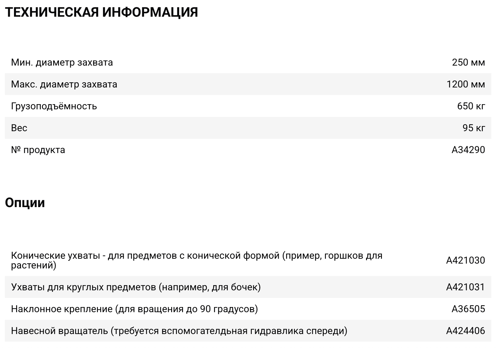 Используется для подъёма и транспортировки предметов цилиндрической формы. Идеально подходит для работы с бочками и кадками для растений. Сила захвата регулируется, что позволяет транспортировать предметы из любых материалов, не повреждая их. Захват оборудован двумя малыми прорезиненными ухватами для работы с меньшими и более хрупкими предметами. Полностью открытый захват позволяет перевозить бочки, кадки для растений большого диаметра и пр.